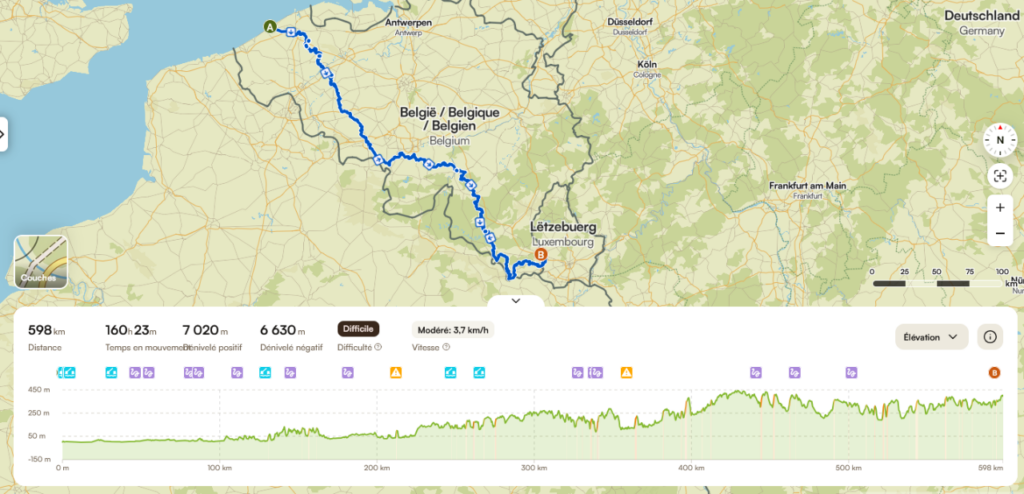 Vous pouvez retrouver son itinéraire complet sur le lien Komoot suivant : Ostende à Arlon par le GR129.