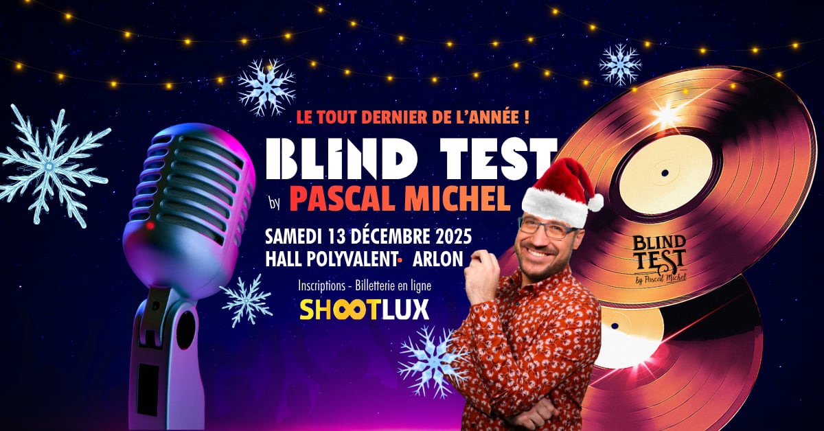Le samedi 13 décembre, le Hall Polyvalent d’Arlon vibrera au rythme d’un Blind Test Géant animé par l’inimitable Pascal Michel une soirée placée sous le signe de la musique, du rire et de la convivialité, comme il en a le secret.